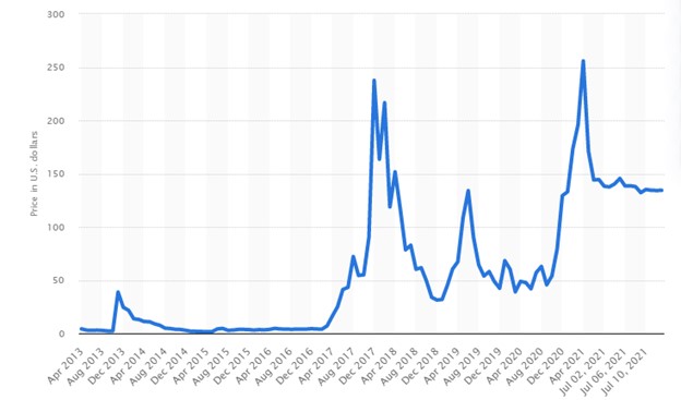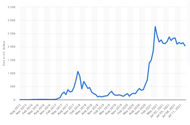 Quando o Ethereum foi lançado em 2015, trocou pouco menos de 70 centavos e manteve um aumento constante até 2017, quando experimentou um aumento de preço no valor de US € 343,42. Ele atingiu US € 1.405,21 em 2018, mas caiu drasticamente para US € 83 até o final de 2018. No primeiro trimestre de 2024, o Ethereum foi avaliado perto da marca de US € 2.000 antes da queda do mercado de criptografia. Há sinais positivos de que o valor do Ethereum continuará aumentando e associado ao projeto de atualização lançado em 2024, será um investimento que vale a pena. Especialistas prevêem que o Ethereum valerá US € 4.000 no ano de 2025.