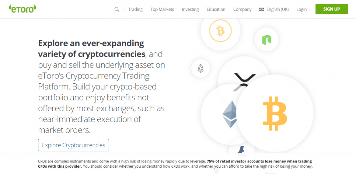 De acordo com os desenvolvimentos tecnológicos modernos, o ETORO é especializado hoje em mercados de criptomoedas. Os comerciantes podem investir em CFDs para as principais criptomoedas, incluindo Bitcoin e Ethereum, bem como os menores, como Eos. Além das criptomoedas, o ETORO também oferece oportunidades de investimento em ações e forex.