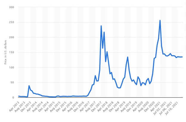 Entre 2015 e 2017, a Litecoin consolidou seu preço de mercado na faixa de US € 3 para cima. Em 2017, especialmente, entre março e julho, subiu de US € 3 para US € 50 e, entre julho e setembro, subiu de US € 50 para US € 80. Entre setembro e dezembro, ele desfrutou do aumento geral da criptomoeda e subiu para US € 371 em valor. Este foi um Aumento de 500% no valor. Os investidores da Litecoin estavam sorrindo até o banco durante esse período.