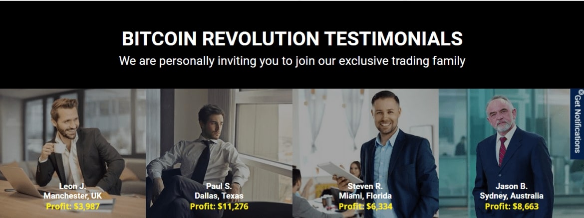 o O valor mínimo do depósito é € 250e o site afirma que a maioria dos comerciantes está ganhando mais de US € 1.000 em lucros por dia. Se essa afirmação é considerada, a revolução do Bitcoin certamente pode ser lucrativa. No entanto, o veracidade de uma declaração tão ousada não segura água. O site também publica vários depoimentos de pessoas que ganharam mais de US € 10.000, mas o que não faz, é divulgar a quantidade de perdas que outros usuários enfrentam.