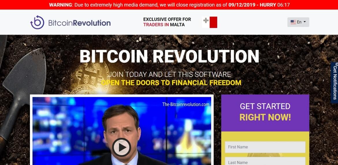 O site da Revolução Bitcoin compartilha muitos recursos comuns de sites de frEURe, como logotipos de empresas internacionais ou fornecedores confiáveis sem nenhum contexto relevante. Além disso, no topo do site está um aviso que devido à demanda As inscrições terminarão em alguns minutos. Este aviso é redefinido toda vez que você atualiza o site.