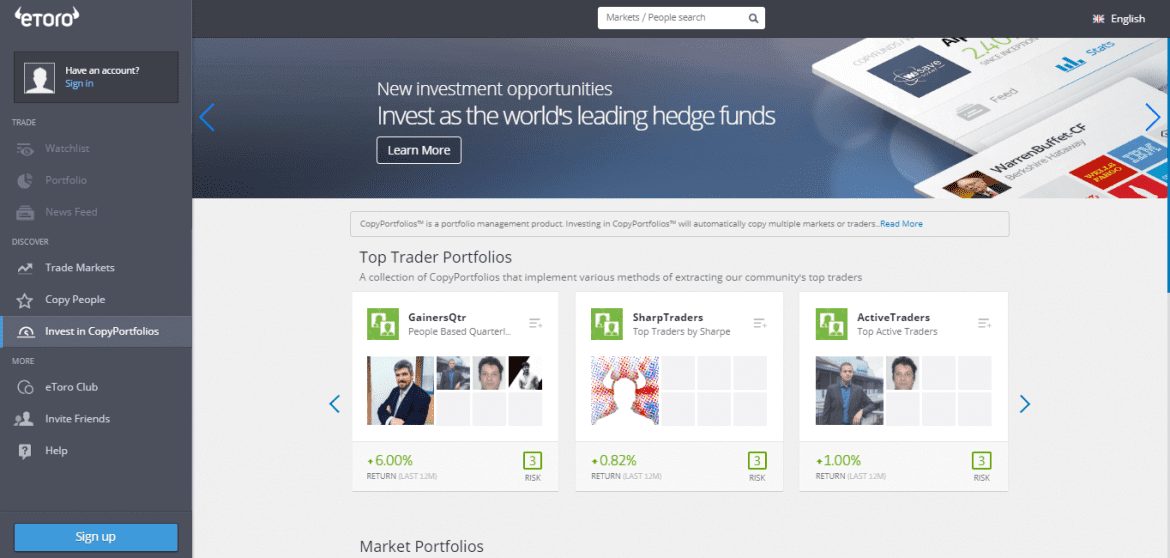 Além de copiar comerciantes individuais que você precisa selecionar, o ETORO oferece um produto premium que oferece recursos e benefícios adicionais. Copyportfolios Permite tirar o máximo proveito da negociação de cópias com o seguinte portfólio: