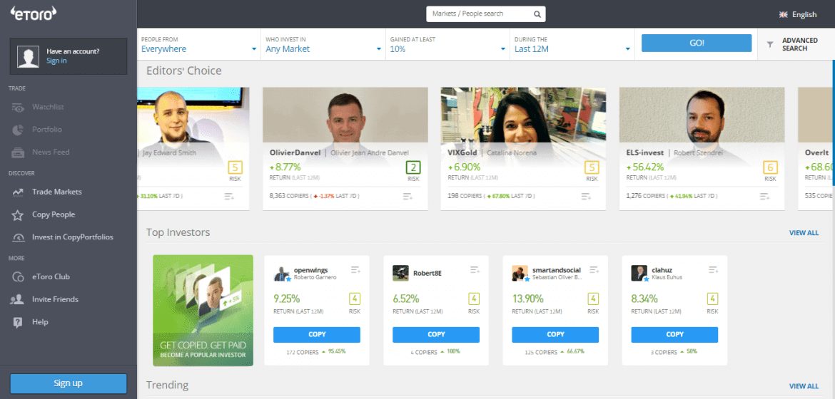 O eToro copytrader é muito fácil de usar, especialmente ao procurar os comerciantes para copiar. Uma vez que você tenha criou uma conta Etoro, você pode visitar a seção "Copiar pessoas", localizada no lado esquerdo do seu painel. Você será apresentado com Centenas de possíveis comerciantes para copiar, o que pode ser bastante esmagador. Felizmente, o eToro oferece Uma variedade de opções de filtro Para ajudá -lo a selecionar comerciantes que correspondam à sua estratégia de investimento de perto.