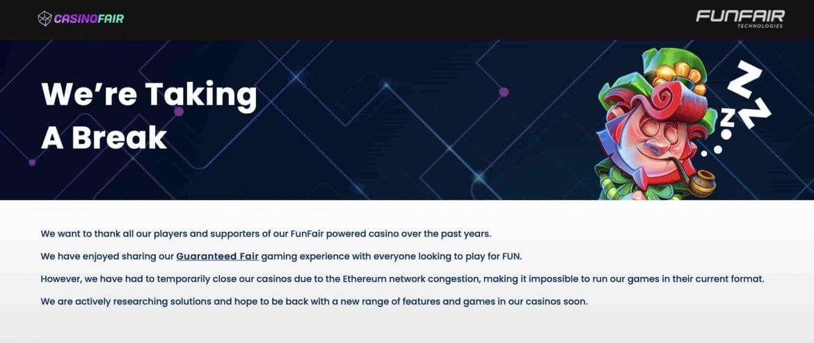 O popular cassino de criptomoedas, Casinofair, anunciou em um post recente que vai parar temporariamente seus serviços de jogo. Citando um congestionamento insustentável na rede Ethereum como a principal razão para essa pausa, o cassino tranquilizou seus jogadores de que "está pesquisando soluções ativamente e espera estar de volta com uma nova gama de recursos e jogos em nossos cassinos em breve".