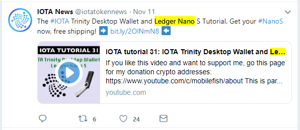 Infelizmente para os detentores de iota, a grande maioria das carteiras de hardware não suporta a IOTA. Até recentemente, nenhuma carteira de hardware suportava a IOTA. Felizmente, o Ledger Nano S agora apoiará a IOTA. Em 2 de novembro de 2018, o A Fundação IOTA anunciou uma colaboração com a Ledger. A carteira se integrará à Fundação IOTA Trinity Wallet, permitindo que os usuários proteguem seus fundos off -line, enquanto conseguem gerenciar suas carteiras através da Trinity.